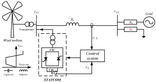 The thyristor-based FACTS devices in wind farms are SVCs. The main structure of the SVC consists of capacitors and inductances that are controlled by thyristors. The STATCOM consists of a main component of modular VSC, which is equipped with IGBTs that are controlled by PWM. Figure 4 shows the structure of an induction generator-based wind turbine and a STATCOM that is connected to a grid and a wind turbine terminal [88]. A coupling transformer is installed to provide galvanic isolation and to control the flow of reactive power during steady- and transient-state conditions [88]. With these modified control strategies, the STATCOMs are superior to other mitigation methods, such as SVCs and series-saturated reactors during normal and transient conditions [89].