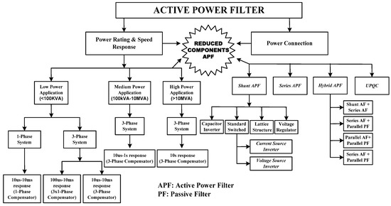 APFs were introduced and investigated as a solution to the limitations of PFs. An APF consists of an active switching device and passive-energy storage devices, such as inductors and capacitors, which provide superior compensation characteristics, including voltage and current harmonics, voltage imbalance compensation for utilities, and current imbalance compensation for consumers. APFs mitigate reactive power, neutral current, changing line impedance, frequency variation, voltage notch, sudden voltage distortion, transient disturbance, and voltage balance and improve the power factor of voltage and current in medium-power systems [30].
