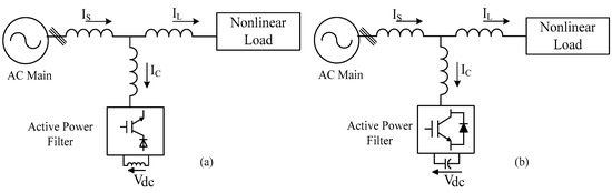 Converter-type filters are classified as VSI and current-fed-type inverters (CSI). Figure 6a illustrates the configuration of the CSI–APF, a bridge structure topology that consists of a diode that is connected in series with a semiconductor self-commutating switching device (IGBT) [28]. The diode is used for reverse voltage blocking with the interfacing DC energy storage inductor in the system. This topology shows high value losses and requires high-value installed AC power capacitors. Furthermore, the dynamic response time is slow, and additional complex control is required to regulate the harmonic current.