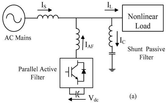 In the past, harmonic grid problems were solved using passive filter (PF) devices [5]. These filters, together with low-cost solutions for power quality issues, are considered the initial stage of development in mitigating current harmonics [6,7]. APFs are considered the second stage of development and an effective solution to overcome the limitation of PFs. However, the size, cost, and rating of APFs are considerably increased by the increasing demand for power system capacity [8,9]. To overcome the issues of shunt APFs, a third stage of development consists of hybrid power filter (HPF) devices, which comprise hybrid combinations of PFs with shunt APFs [10]. Furthermore, HPF technology is evaluated in the fourth stage of development as a unified power quality conditioner (UPQC) [11]. Previous research [12,13] on power quality improvement has led to important developments in FACTS devices, namely, the static volt-ampere reactive (VAR) compensator (SVC), dynamic voltage restorer (DVR), and distribution STATCOM (DSTATCOM) [14,15,16]. Such improvements compensate for the mitigation problems related to power quality, including poor load power factor, load harmonics, imbalanced load conditions, and DC offset in loads.