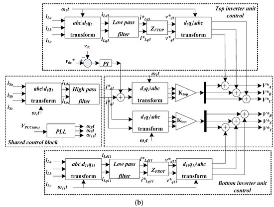 A six-switch inverter circuit, which consists of a two-leg inverter coupled with a single DC-link capacitor, is presented [125]. The number of semiconductor devices is reduced from a two-leg nine-switch inverter to a low-cost two-leg six-switch inverter circuit. The six- and nine-switch APF–VSI is connected in series with two passive LC filters in shunt position to the AC power transmission line without installing any matching transformer. The improved compact circuit design displays higher compensation results than the conventional 3P3W APF–VSI. A combination of feedback and feed-forward control loops is adopted as an advanced control scheme [126,127]. Figure 9b illustrates the control block diagram, which controls each unit and consists of three subsystems [128], which are a top and a bottom inverter unit and a shared control unit. Each PF is tuned at different harmonic frequencies to mitigate the 5th and 7th harmonics at the top inverter and the 11th and 13th harmonics at the bottom inverter. This PF also maintains the balance of DC-link voltage compensation. To reduce the DC-link current through the DC side of the system, a capacitor is installed between the DC-link poles and the PCC [129]. However, the shared control unit operates with PLL scheme, which consists of a simple and robust voltage pre-filter. This unit generates a quasi-square wave, thereby proving its advanced compensation and harmonic contents compared with those of conventional APF systems. Additionally, the H-bridge modular structure type reduces manufacturing cost and presents rapid production rate and high reliability. The controller should track a single capacitor voltage, thereby reducing the complexity of the voltage regulation, and requires additional voltage sensors in terms of multilevel inverter configurations [130,131].