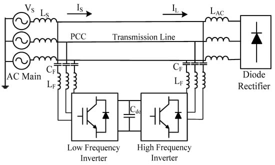 A dual-hybrid converter stage or parallel-inverter topology is depicted in Figure 10 [132]. In this topology, the rectifier and inverter are coupled with a parallel DC-link storage device in the APF topology but maintains a large number of switching devices. The conventional coupled back-to-back H-bridge inverter is a well-established, low-voltage configuration used in many industrial applications [133,134]. This inverter usually consists of twelve switches. On the contrary, the improved configuration eliminates four switches from each inverter, thereby reducing the total number of switches to eight; the scheme is adopted to eliminate a single leg in each power converter by connecting the third phase to the negative terminal of the individual VSI [135]. The new configuration increases system reliability and decreases voltage stress across the active switches.