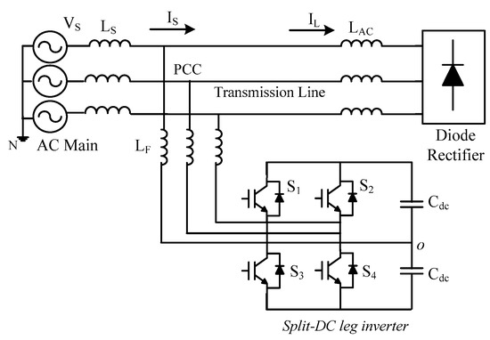 Harmonic sources are generally classified into two types on the basis of system impedance, namely, current and voltage types [22]. A diode rectifier with smoothing inductor is categorized as a current harmonic source because it produces the current harmonics at the source side, which is the input of the rectifier. A diode rectifier with smoothing capacitor is a voltage harmonic source, which is affected by the AC-side impedance and generates harmonics at the output of the inverter. Two international standards of IEEE-519, namely, IEEE Recommended Practices and Requirements for Harmonic Control in Electrical Power Systems and IEC 61000-3-2 [23,24], provide limitations and guidelines for manufacturers and power utility companies that are connected to the power grid. These standards address harmonic issues, such as current harmonics, power quality, grounding, and voltage harmonics.