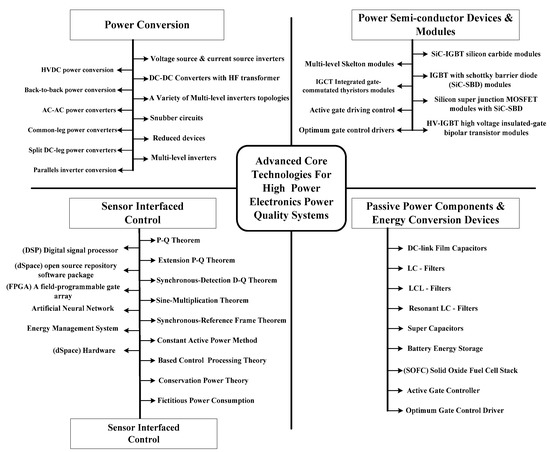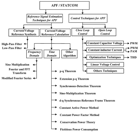 Electricity is an indication of comfortable life, and the demand for this energy source is increasing. Development in power industries increases the number of linear and nonlinear loads in each system. In nonlinear load conditions, many solid-state switching converters draw reactive power and current harmonics from the AC grid. These nonlinear loads generate harmonics, which produce disturbance and directly influence human life. Nowadays, each piece of equipment, power system, and service, such as furnaces, computer power supplies, communication systems, renewable energy systems, electrical power generations, and high-voltage systems, requires a continuous power supply. Researchers and different power companies are continuously exploring solutions to power quality problems [1], such as harmonics, system imbalance, load balancing, excess neutral current, and power system grid intrusions. Evidently, the increasing demand for nonlinear loads produces harmonics in the power system, thereby resulting in poor power quality. Flexible AC transmission system (FACTS) devices, such as static compensators (STATCOMs) and active power filters (APFs), are the most dominant technologies available for industrial and commercial purposes and are deemed the solution to this power quality problem [2,3,4].