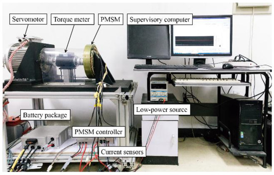 With the purpose of verifying the effectiveness of practical algorithm in the paper, experimental tests are implemented with the test bench shown in Figure 4. The experiment is performed basically utilizing a PMSM coupled to a magnetic-power brake dynamometer that is used to provide the external load. The parameters of 2 kW PMSM are given in Table 3. The other configuration of experimental devices contains a LiFePO4 battery pack, a torque meter and a three-phase inverter system developed internally. A six-leg bridge drive circuit with single IGBTs (AUPS4067D1) (Infineon Technologies, Munich, Germany) constitutes the subject of inverter and digital signal processor (MC56F8346) implements the proposed algorithm when three Allegro current sensors are used to measure stator phase currents.