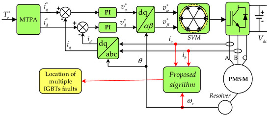With the advent of worldwide shortage of energy sources, global warming and the more stringent emission regulations, electric vehicles have played a significant role for the society [1,2,3,4]. The popularity of electric vehicles makes electrical machines more widely used and the corresponding drive systems are receiving more and more attention in the field [5,6]. Although, the current drive systems have already achieved a high level of maturity, they are still inclined to undergo several unpredictable failures due to the complicated structure and exposure to high stress environments [7]. In order to decrease the expense and develop the reliability of the drive systems, the corresponding fault diagnostic algorithms have been the research hotspots during the last decade [8,9,10]. Furthermore, fault diagnosis is the foundation of the follow-up fault-tolerant control, which has great significance to the safety and operation reliability of electric vehicles.