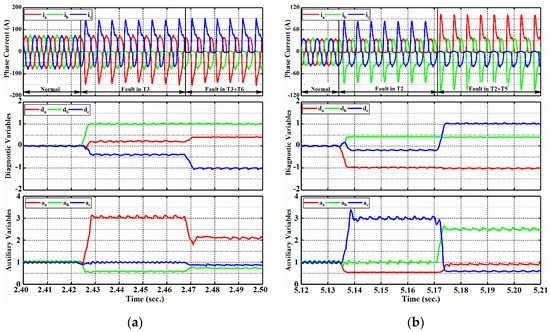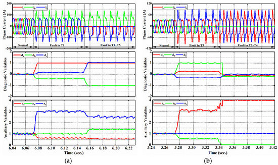 As shown in Figure 6a, under normal condition, three-phase current waveforms are sinusoidal and symmetrical, resulting in diagnostic variables equivalent to zero along with auxiliary variables approximately equivalent to 1. When the first open circuit fault in T3 occurs at t = 2.424 s, phase B current is prevented in the upper half-bridge leg while remaining currents are distorted with the maximum value up to 145 A. Consequently, diagnostic variable increases and exceeds the identified threshold and afterwards detection threshold dramatically, converging to the final value of 1, while the other diagnostic variables reach to near 0.23 and 0.38, respectively. Fast fault identification and localization are realized and they take only 0.85 ms and 1.5 ms (approximately 12% and 18% of fundamental current period). At t = 2.467 s, the second open circuit fault in T6 is introduced and diagnostic variables changed again owing to phase current which is eliminated at the lower half-cycle. After this moment, diagnostic variable decreases to near −1 rapidly and converges to approximately 0.4 while keeps a value of about 1 since fault in T3 is not removed.