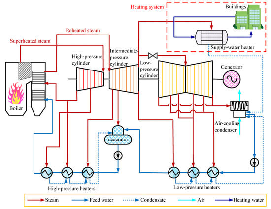 - Feng, P.; Wang, N.; Yang, Z.; Li, X.; Yang, Y. Cascade heating characteristics and off-design collaborative optimization of direct air-cooled high-pressure heat supply power units. Proc. CSEE 2016, 36, 5546–5554, 5731. (In Chinese) [Google Scholar]