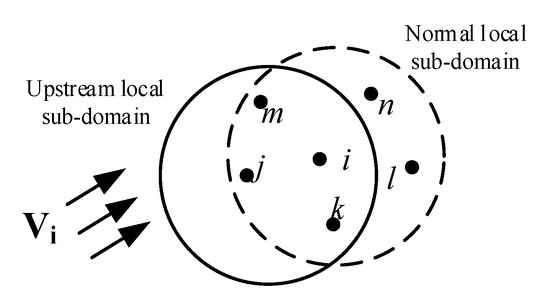 Because the meshless method only requires node partitioning when constructing shape functions, it is very convenient to select the upstream node by controlling the size, as well as the position, of the local support domain. The selection of the upstream node is shown in Figure 2: