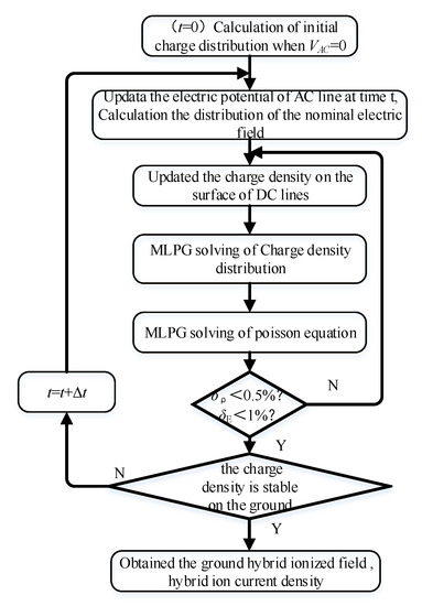 Based on the MLPG method, the calculation process described in this paper is shown in Figure 3. As Figure 3 shows, the calculation of the hybrid ionized field is carried out in the time domain. In order to accelerate the convergence of the algorithm, the space charge density of the DC wire is calculated as the initial charge density of the hybrid electric field. In the process of calculation, every parameter is determined under normal weather, including the starting corona electric field, ion mobility, etc.