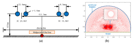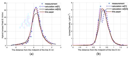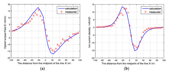 To verify the method proposed in this paper, the calculation results are compared with Reference [7,25]. The AC/DC hybrid line reduced-scale model is shown in Figure 4, and the split wire is equivalent to the wire with the equivalent radius. The hybrid ionized field and ion current density at ground level are calculated by the method proposed in this paper. The comparison results are shown in Figure 5a,b.