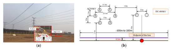 In addition, the field distribution of the parallel line at about ±800 kV DC/500 kV AC has been studied. The field experiment and the wire structure are shown in Figure 6.