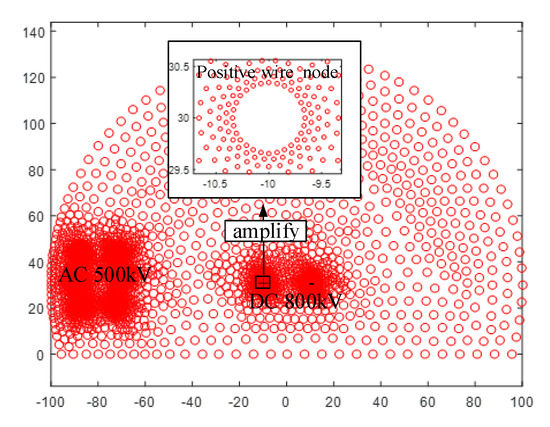 In recent years, researchers have studied on the calculation of hybrid ionized field by numerical calculation [3,4,5,6,7,8,9,10]. Yin, H., et al. [3] proposed an upwind finite volume-based algorithm for the solution to the AC/DC hybrid ionized field that considered the influence of the space charges generated by corona. The electric field was solved by the charge simulation method and the finite-element method, while the advection and recombination effects of the space charges were solved by a time-dependent finite volume method. Zhou, X., et al. [4] proposed a time-efficient method based on the finite element method (FEM) and finite volume method (FVM), where the charge injection was determined by an iterative procedure at each time-step. The algorithm combines the advantages of FEM and FVM, and has good numerical stability in calculation. The charge simulation method (CSM) and the FEM were applied to calculate the electric field, which was proposed by Li, W., et al. [6], while a time-dependent upwind differential algorithm was applied to calculate the migration of space charges. Furthermore, a variable time-step discretization method was introduced to accelerate the computational process in Ref. [6]. Tian, Y., et al. [7] proposed a nodal discontinuous Galerkin time-domain method to calculate the hybrid ionized field, and the corona interactions between the HVDC/HVAC lines were considered in the process of numerical solution. Poisson’s equation was solved by the nodal DG method (DGM), as well as the current continuity equations in the time domain. Space domain was calculated by the nodal DGM and low-storage version of the fourth-order Runge–Kutta (RK4) method, respectively. Guillod et al. [8] presented the new characteristics method for solving the stationary ion-flow of hybrid lines.