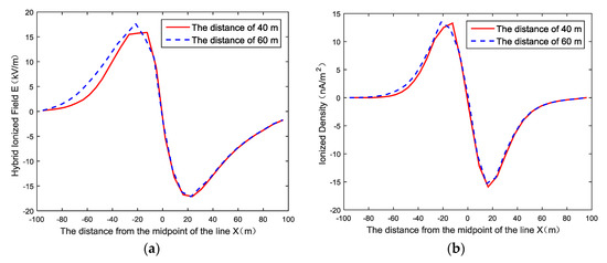 To confirm the influence of the approach distance to the hybrid ionized field in the transmission line, we used the line parameters in Figure 6 to calculate the hybrid ionized field and the distribution of the ion current density, which only change the approach distance from 60 to 40 m. The result of the calculation is shown in Figure 9 and Table 1. When the distance became shorter, the maximum values of the ionized field and ion current density were reduced by 9.86% and 2.96% respectively. The average values of the ionized field and ion current density were reduced by 36.7% and 19.5% respectively. The main reason for this is that when the distance is shorter, the influence of the AC electric field on the space flow motion of the ion is greater. Because of the shielding effect of AC lines, the ground ionized field is reduced.