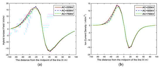 To study the effect of AC voltage upon the hybrid ionized field, we used the line parameters in Figure 6 to calculate the hybrid ionized field and the distribution of the ion current density while only changing the division number and voltage grade of the AC lines. The hybrid ionized field were calculated when the voltage of the AC lines was 220 kV, 500 kV and 750 kV, respectively. The calculated result is shown in Figure 10 and Table 2. With increasing AC voltage, the hybrid ionized field and ion current density on the ground decreased. When the voltage of the AC lines changed from 220 to 500 kV, the maximum ionized field and ion current density were reduced by −0.17% and 2.1%, respectively. The average values of the ionized field and ion current density were reduced by 9.1% and 11.4%, respectively. When the voltage of the AC lines changed from 500 to 750 kV, the maximum values of the ionized field and ion current density were reduced by 2.9% and 8.1%, respectively. The average values of the ionized field and ion current density were reduced by 7.02% and 8.78%, respectively. The reason for this is that with the increase in the AC electric field, the motion disturbance of the space charge is enhanced, making the distribution of space charge under the line more dispersed.
