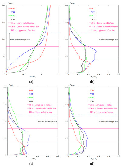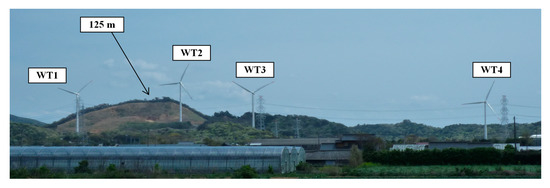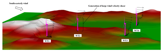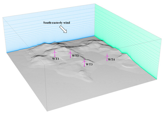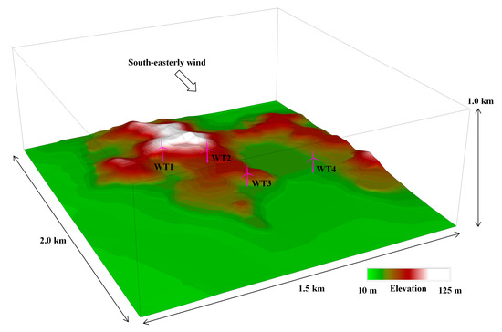 - Uchida, T. High-Resolution LES of Terrain-Induced Turbulence around Wind Turbine Generators by Using Turbulent Inflow Boundary Conditions. Open J. Fluid Dyn. 2017, 7, 511–524. [Google Scholar] [CrossRef]