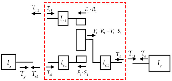 where T, I and ω denote torque (N·m), moment of inertia (kg·m2) and rotational speed (rad/s), respectively. As for the subscripts: r1, c1 and s1 denote the front ring gear, planetary carrier and sun gear, respectively; e the engine; g is for MG1. R1 and S1 are the radii (m) of the front ring gear, and sun gear, respectively. F1 is the internal force (N) of PG1. We specify left as the positive direction of torques.