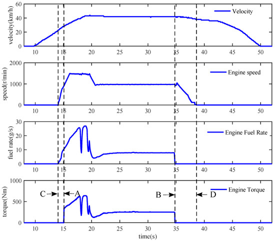 According to the trend of velocity in Figure 6, Cycle 1 Part 1 of the investigated dual planetary power-split HEB can be divided into the starting condition, acceleration condition, constant velocity condition, braking condition, and parking condition. Furthermore, on the basis of the operating mode of the investigated power-split HEB, the above operating conditions can be further subdivided. From 10 s to A in Figure 6, the power-split HEB operates in electrical vehicle (EV) mode, and the vehicle, driven solely by MG2, launches and accelerates. From C to 20 s in Figure 6, the power-split HEB operates at electronic variable transmission (EVT) sport (EVT-S) mode, where the engine, together with MG2, work at a heavy load with large torque changing rates to meet the driver’s accelerating request. From 20 s to B in Figure 6, the power-split HEB operates at EVT economic (EVT-E) mode, where the engine and MG2 are in a relatively stable state, with both torques relatively low. From B to 50 s in Figure 6, the power-split HEB operates at RB mode, where the engine stops and MG2 works at generating condition to recover vehicle kinetic energy, and the vehicle decelerates and stops eventually.
