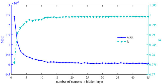 The number of neurons in each hidden layer is determined by the values of MSE and R. The variation profiles of MSE and R under different hidden neurons are shown in Figure 7.