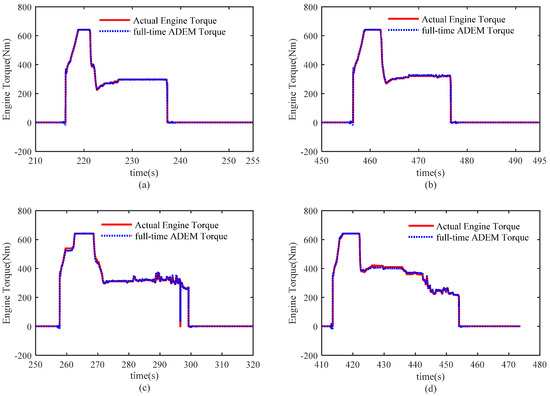 Global generalization capability refers to the capacity of the trained full-time AEDM to fit actual engine torques of the Parts of the other cycles in response to the difference in velocity trend and power-source operating conditions among cycles. Only the comparison results between the full-time AEDM output torques and actual engine torques in Cycle 2 Part 4 and Cycle 3 Part 6 are shown due to space limitations (Figure 8c,d). The full-time AEDM can fully predict the real-time torque of the engine beyond Cycle 1 with certain small discrepancies. Therefore, the trained full-time AEDM has good global generalization capability.