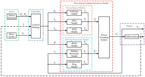The remaining sections of this study are organized as follows: in Section 2, the configuration of the dual planetary power-split HEB is introduced, and a system dynamics analysis is conducted to obtain the essence of vehicle jerk. In Section 3, the modeling process of full-time AEDM based on real vehicle data is introduced. In Section 4, the integrated vehicle dynamics model is established, and its accuracy is validated. In Section 5, the reasons for vehicle jerks that occur in real drive cycles are summarized, and the corresponding solution (power-source TCRL strategy) is proposed. Moreover, the effectiveness of the proposed strategy is validated by simulation. In Section 6, the conclusions and remarks are presented.