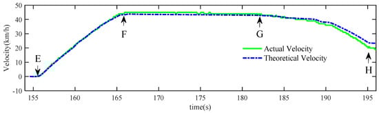As shown in Figure 10, Cycle 1 Part 4 can be divided into three consecutive driving phases according to the trend of vehicle velocity: the EF acceleration phase, the FG uniform-velocity phase, and the GH braking phase. In the EF phase, the theoretical velocity can follow the actual velocity nearly without any deviation. In the FG and GH phases, the trend of theoretical velocity is consistent with actual velocity, accompanied with some insignificant and acceptable discrepancies. Inevitable error in the actual velocity measurement and possible inaccuracy in the estimation of rolling resistance and air resistance all likely contribute to uncertain deviation between the theoretical velocity and the actual velocity in the FG and GH phases.