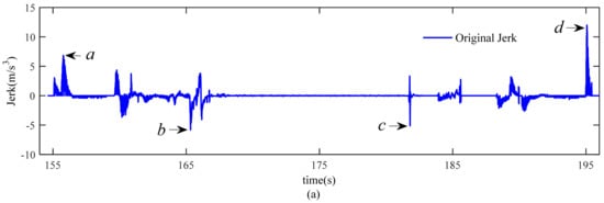 Cycle 1 Part 4 is still adopted here as an example to calculate the vehicle jerk because the calculation process of any drive cycle is similar. The calculated vehicle jerk of Cycle 1 Part 4 is plotted in Figure 11a.