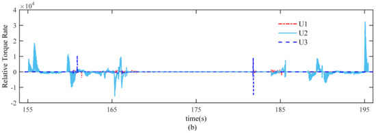 (a) Torques of power sources around first peak-jerk point of Cycle 1 Part 4; (b) Relative torque changing rates around first peak-jerk point of Cycle 1 Part 4.