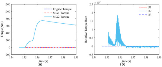 The first peak-jerk point in Cycle 1 Part 4 is taken as an example to conduct a detailed jerk analysis. As shown in Figure 11a, the first peak-jerk point in Cycle 1 Part 4 occurs at 155.8 s, and the intensity of jerk is 6.851 m/s3 with the positive direction. A partial diagram of the output torques and the relative torque changing rates of the three power sources around the first peak-jerk point is depicted in Figure 12a,b. According to the velocity trend of Cycle 1 Part 4 in Figure 10, the investigated power-split system works at EV mode to launch the vehicle when the first peak jerk occurred. The output torque of MG2 increases drastically to satisfy the driver’s launch demand, thereby generating a large relative torque changing rate of MG2 of up to 1.847 × 104. According to Equation (16), a large U2 leads to a large positive vehicle jerk.