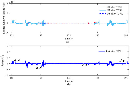 (a) Relative torque changing rates after torque changing rate limitation (TCRL) of Cycle 1 Part 4; (b) System jerk after TCRL of Cycle 1 Part 4.