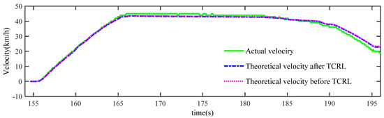 As shown in Figure 14, the theoretical velocity after TCRL can still follow the actual vehicle velocity with some insignificant inconsistencies, and the two theoretical velocities (one before and one after TCRL) calculated by the vehicle dynamics model are nearly identical. Thus, the proposed TCRL strategy does not significantly affect vehicle performance while improving vehicle riding comfort.