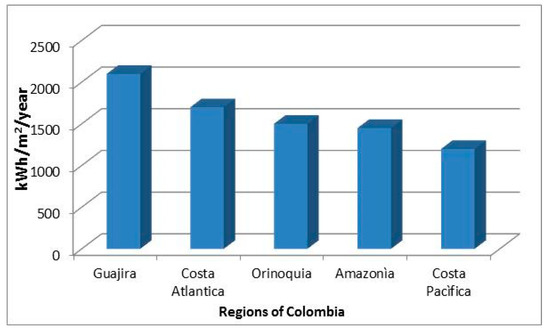 In general, the whole territory of Colombia has a good solar energy potential, with a daily average insolation of around 4.5 kWh/m2 (La Guajira Peninsula, with an average value of 2.200 kWh/m2/year can be highlighted) (Figure 1). Although Colombia has favorable legislation for alternative energies, the costs of implementation of photovoltaic systems compared to other energy sources remain high, with current costs of 2100 USD/kWp, only exceeded by geothermal generation at 2200 USD/kWp and higher than hydroelectric power plants with costs of 1300 USD/kWp, coal-fired power plants of 800 USD/kWp, thermoelectric plants with combined cycle gas with 900 USD/kWp, wind power plants at 1200 USD/kWp and cogeneration 500 USD/kWp. However, due to the low operation and maintenance costs of photovoltaic systems, these can surpass coal-fired power plants and combined-cycle gas-fired thermoelectric plants, making them an excellent alternative to be included in the Colombian energy matrix.