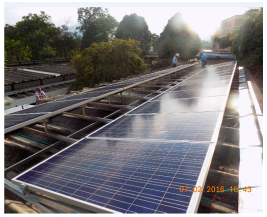 The experimental photovoltaic system has operated from February 2016 to date. It is located in block 3 at the Universidad de Ibagué at 1285 above sea level, latitude 4°26′54″ N, longitude 75°11′56″ W. The structure is made of I-beams of AISI 1045 steel, whose slope was calculated to be 12.3°, as shown in Figure 2, The system consists of 30 panels tilted at a fixed angle of 14° and oriented towards the north with an azimuth of 4°, it is divided into three modules with 10 IBC PolySol 260-CS polycrystalline silicon panels each (Colombinvest, Bogotá, Colombia, Table 1), which are connected in series covering an area of 49.1 m2. A Fronius Primo 7.6-1 inverter (Colombinvest, Bogotá, Colombia, Table 2) with a rated maximum efficiency of 96.9% and maximum AC power of 7600 W is also part of the circuit, as well as the Itron ACE300 bidirectional counter (Colombinvest, Bogotá, Colombia), which measures the data about the total energy generation.