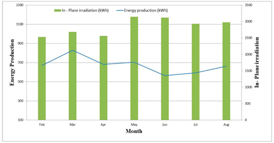 Figure 5 shows the maximum energy output of the photovoltaic system in March 2016 with 72.65% (850 kWh) of the total installed capacity (1170 kWh). This percentage is similar to those found by [48,49], which recorded 70%; Moreover, it is very close to the values between 80% and 100% given in other references [50].