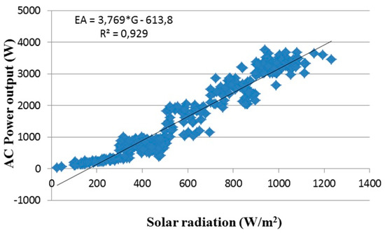 In contrast, the equation that correlates the electrical energy output (EA) with the solar radiation (G) is EA = 3.769G–613.8 with a correlation coefficient of 0.929. Figure 6 shows that the output power (EA) has a linear relationship with solar radiation. The importance of an equation like this is that it makes possible to evaluate the generation of energy using photovoltaic power systems, only by identifying the solar radiation.