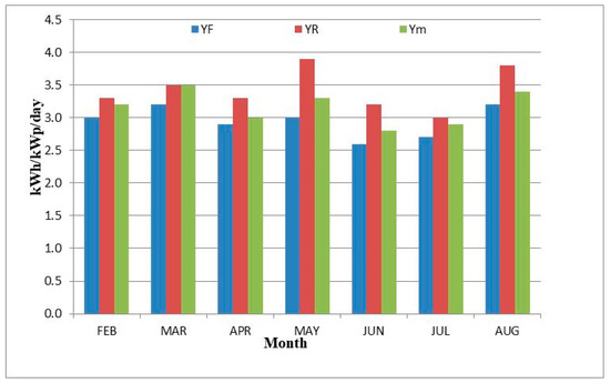 Subsequently, in Figure 7, it is observed that the lowest values of the monthly reference mean (YR), Module (Ym) and final yields (YF) coincide with the rainy season and are 3.0 kWh/kWp/day, 2.8 kWh/kWp/day and 2.6 kWh/kWp/day, respectively, during the months of June and July 2016. The highest reference performance values of 3.9 kWh/kWp/day were recorded in May 2016, the yields of the modules and final were 3.5 kWh/kWp/day and 3.2 kWh/kWp/day for the March 2016, respectively.