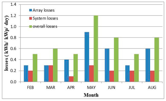 On the other hand, the maximum total loss ocurred in May and the minimum in April with values of 1.1 kWh/kWp/day and 0.4 kWh/kWp/day, respectively. These values correspond to 29% and 12% of the respective reference yields. The values differed very little from those reported by [52] of 27.1% and 6%. The average annual loss of the inverter and total losses was 0.5 kWh/kWp/day, 0.20 kWh/kWp/day and 0.7 kWh/kWp/day, respectively. These values are lower than those reported from 0.71 kWh/kWp/day, 0.27 kWh/kWp/day and 1.05 kWh/kWp/day [52].