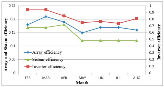 To continue, in Figure 9, the highest efficiency values of the modules, the system and the inverter were obtained during March and April with values of 21%, 18% and 94%, respectively. The lowest in May and June with values of 15%, 12% and 74%, respectively. The average monthly efficiency of the modules, the system and the investor during the registration period are 17.6%, 14.3% and 82.8%, respectively. The maximum values are found early in the morning and the minimum values at the end of the day.