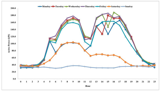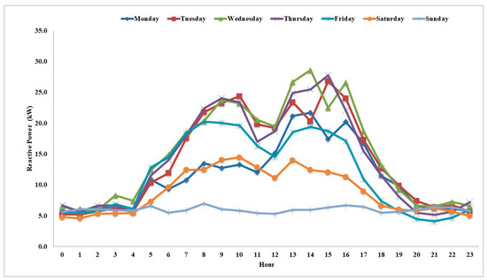 When comparing the measurements of active power before and after the installation of the photovoltaic solar system, Figure 10 and Figure 11 showed no significant difference, during the academic term there was a maximum consumption of 190 kWh/day and a minimum of 30 kWh/day. During Sunday, a decrease in consumption of 8 kWh/day from 10:00 a.m. to 3:00 p.m., coinciding with the period of operation of the photovoltaic system and the absence of academic activity at the Universidad de Ibagué. Therefore, it is confirmed that the photovoltaic system contributes to the active energy consumption, being visible in periods of low demand. The reactive power consumption increased by 7% in relation to the maximum value recorded and 40% in relation to the minimum obtained.
