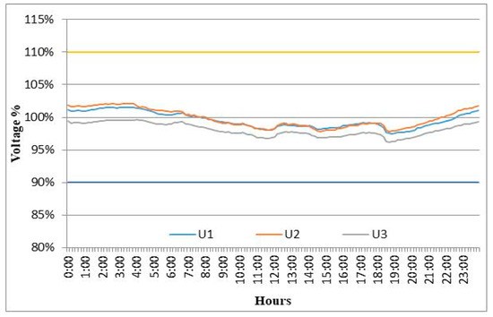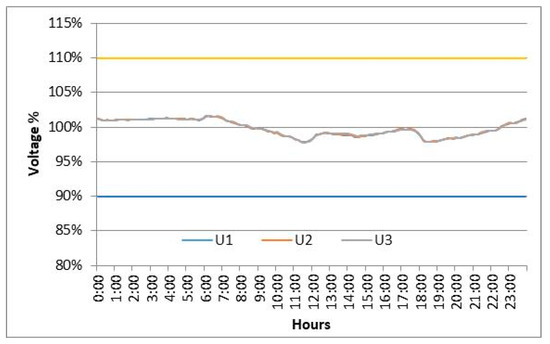 The maximum percentage obtained was of 102.87% and the minimum of 94.08% with respect to the standard value of 100% proposed by the NTC 5001. The value of the voltage after installing the experimental system is more stable because the inverter only injects energy when it is in synchronism with the network (Figure 6), the value of the voltage registered an increase of 7.88%, 5.87% and 6.27% in the lines U3, U2 and U1, after installing the experimental system. The values found are similar to those reported by [58,59], who found very small increases, that in some cases reached 2%.