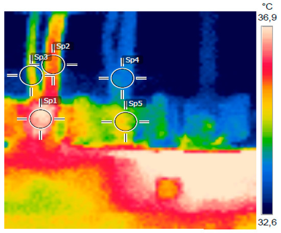 The maximum and minimum temperatures obtained at the common connection point before the photovoltaic system came into operation were 34.3 °C and 31.4 °C, respectively (Figure 14). Once the system came into operation, the maximum and minimum temperatures recorded were 36.9 °C and 33.7 °C, respectively (Table 11). Therefore, the increase at the common point of connection of the temperature is 7.5%. This increase is within the requirements established by the NTC 2050 and the BWG.