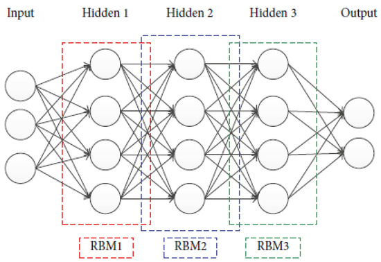 The DBN is a deep neural network that consists of several layers of restricted Boltzmann machines (RBMs) and a layer of neural network (NN) [34]. The network structure of a typical DBN is shown in Figure 1.Traditional NN models adopt a gradient descent algorithm as the main training method, which is easily trapped in a local minimum value. When the NN structure becomes deep, this drawback becomes apparent because numerous network parameters need to be optimized. Initializing the network parameters to the greatest extent possible is a more sensible method to mitigate the local optimum dilemma. Consequently, in the search spaces, if the network parameters are initialized close to the optimal values, the opportunity to find out the global optimum will also greatly increase. With regard to DBNs, the training process consists of two components: a layer-wise pre-training process and a fine-tuning process. The former is applied to provide better initial values of the network parameters, and the latter is applied to search the optimal parameters based on the initial states of the network.