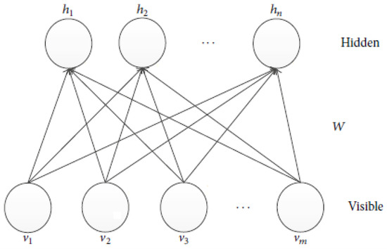 A restricted Boltzmann machine (RBM) can learn a distribution from its input sample, which is a stochastic two-neural network [35]. The network generally consists of two different layers of nodes: visible nodes and hidden nodes. There are connections between nodes in different layers, while there are no connections between nodes in the same layer. Connections between nodes are symmetric and bidirectional. RBMs have been applied to generate models of various data types. A single RBM is shown in Figure 2.
