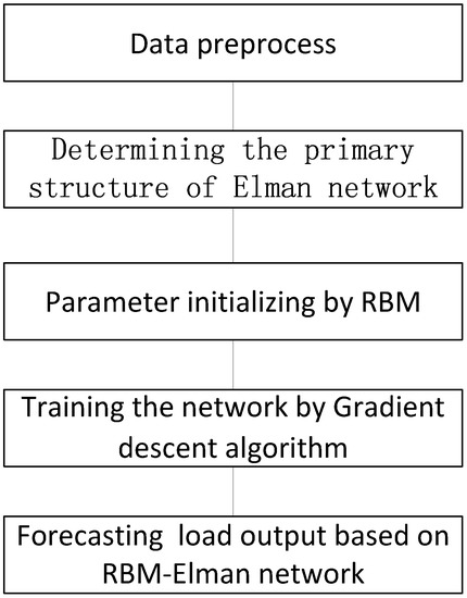 Elman neural networks inherit some defects of BP neural networks. For example, a slow convergence rate and being easily trapped in local optima. These deficiencies are partly due to the randomly initialized parameters. Therefore, we proposed an RBM to initialize the weights and thresholds of Elman neural networks, by which we expected generalizability and the training speed of Elman neural networks to improve. The basic steps of our proposed method are described as follows, and Figure 4 shows the model implementation flowchart.