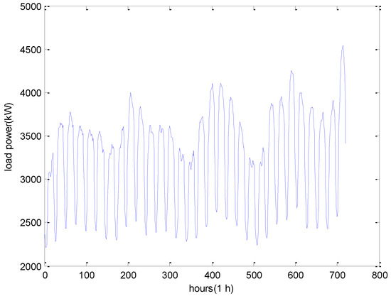 The historical power load data of a town in the UK is employed to investigate the forecast effect of our proposed model. The chosen dataset is composed of 24 h of load data from 1 January 2014 to 31 December 2014. The whole dataset is further divided into two subsets: the training set and the testing set. In this study, about 80% of the whole dataset, i.e., the first 292 days, is chosen as the training set. The rest of data is applied to test the forecasting performance of the proposed model. Figure 5 shows an example of load data for June 2014.