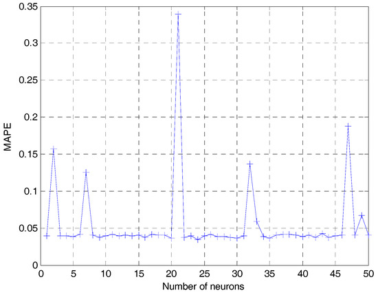 Next, the trial and error method was employed to investigate the number of nodes in the hidden layer. The trial and error results of Elman model are illustrated in Figure 6. From the Figure, we can observe that the mean absolute percentage error (MAPE) index of the model achieved optimal performance when the number was 24. Hence, the structure of optimal policy for Elman neural network is 10-24-1, and the number of context layer nodes was also 24.