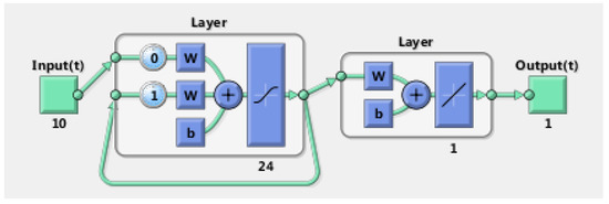 In the end, for this neural network, the activation functions in the hidden layer and the output layer were the common tan-sigmoid and pure linear function, respectively. The diagram of the model is illustrated in Figure 7.