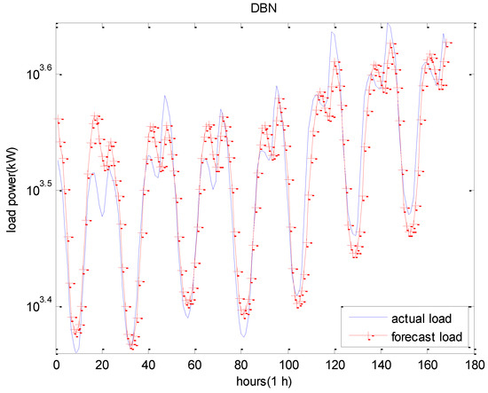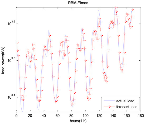 The proposed RBM-Elman model was employed for use in a short-term load prediction. For comparison purposes, a DBN model was designed to perform the short-term load prediction with the same dataset. A typical three-layer Elman neural network was also employed to demonstrate the validity of our proposed model. The results obtained by each prediction method are illustrated in Table 2. Furthermore, the forecasting results by RBM-Elman model for test data are illustrated in Figure 8. For a better visualization, the results of seven consecutive days are also illustrated in Figure 9. The forecasting results of seven consecutive days by the DBN model and Elman model are illustrated in Figure 10 and Figure 11, respectively.