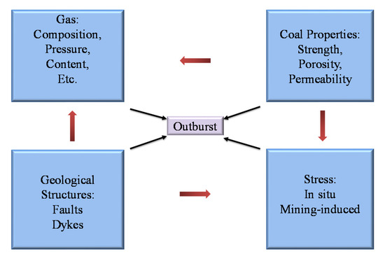 - Beamish, B.B.; Crosdale, P.J. Instantaneous Outbursts in Underground Coal Mines: An Overview and Association with Coal Type. Int. J. Coal Geol. 1998, 35, 27–55. [Google Scholar] [CrossRef]
