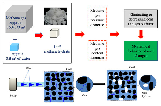 Coal and gas outburst will eject a large amount of coal and gas very shortly [1]. Disaster will become more serious for deeper coal mining [2,3]. So far, four factors shown in Figure 1 are found to have effects on the gas outbursts [4]. Among these factors, the outburst is very sensitive to gas, considered by most of scholars [5]. Therefore, techniques to prevent this kind of disaster contain: (1) rising up permeability of coal; and (2) decreasing stress in coal seams [6]. Commonly, gas drainage and hydraulic fracturing are adopted to prevent coal and gas outbursts, as well as directional drilling, or water infusion [2,7,8]. Additionally, if a coal seam is strengthened, outbursts can be eliminated [9]. For instance, Wu et al. successfully synthesized artificial methane hydrate (MH), and they used a hydrate method for outburst prevention [10]. Mechanism of the method is illustrated in Figure 2. Coal mine and gas, such as methane, can generate MH with water at a temperature of 0.55 °C and a pressure of 2.77 MPa, and the formed MH is energy-dense. Then, it is possible to reduce gas content and gas pressure significantly, which can decrease or eliminate risks of coal and gas outbursts. Consequently, evaluating the mechanical properties of MH–coal mixtures is very important when applied to outburst prevention.